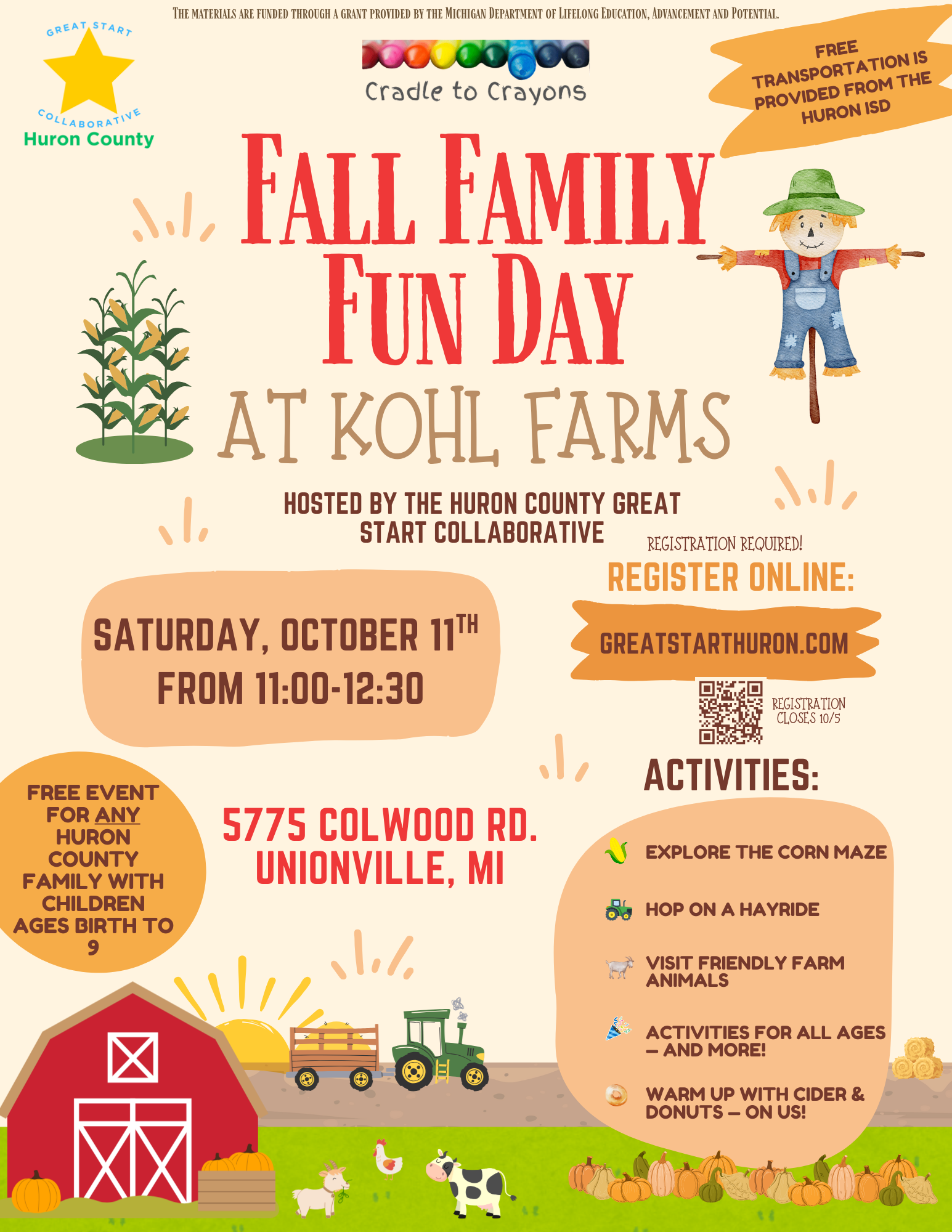 Cradle to Crayons is an initiative by the Huron County Great Start Collaborative focused on supporting families with young children from birth through age five. This program is dedicated to providing resources, information, and support to help parents and guardians ensure their children are ready for school and thrive in a nurturing environment.